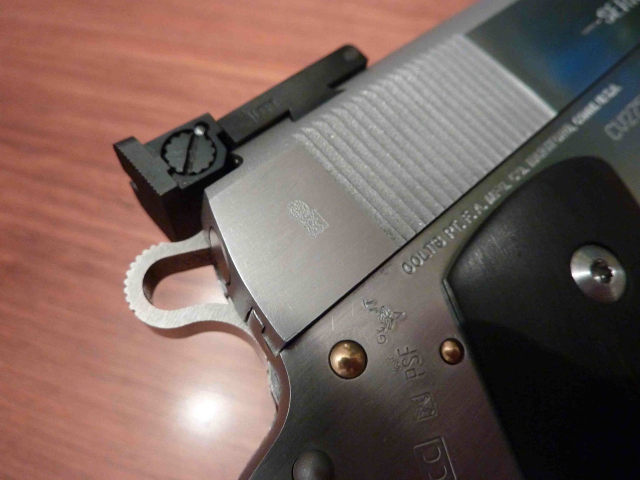 Llevo un tiempo mirando alzas de combate, que estéticamente me gustan más que las que monto, Colt tipo Bo-Mar (que son cojonudas y de primera calidad, por cierto), pero los rebajes de factoría que lleva el arma en la corredera, me hacen dudar sobre qué modelo podría quedarle bién estéticamente.