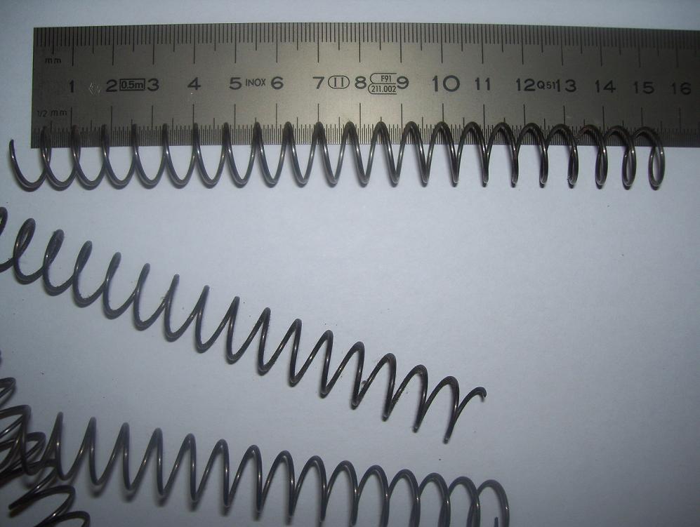 Por lo que ya comentaste parece que tu muelle está cortado. Puedes comprobar si un extremo está "chafado" y el otro no. Realmente entre el grosor de 1mm y el de 1.02mm no debería de haber diferencia apreciable. Extraña que hayas medido menos peso en el más largo, claro que el método ...