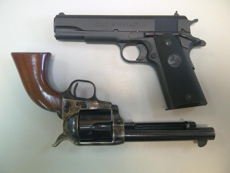 Si la vista no me falla, en la fotografía podemos ver una pistola Colt y un precioso revólver Uberti Cattleman.