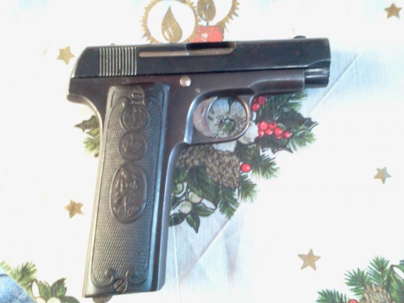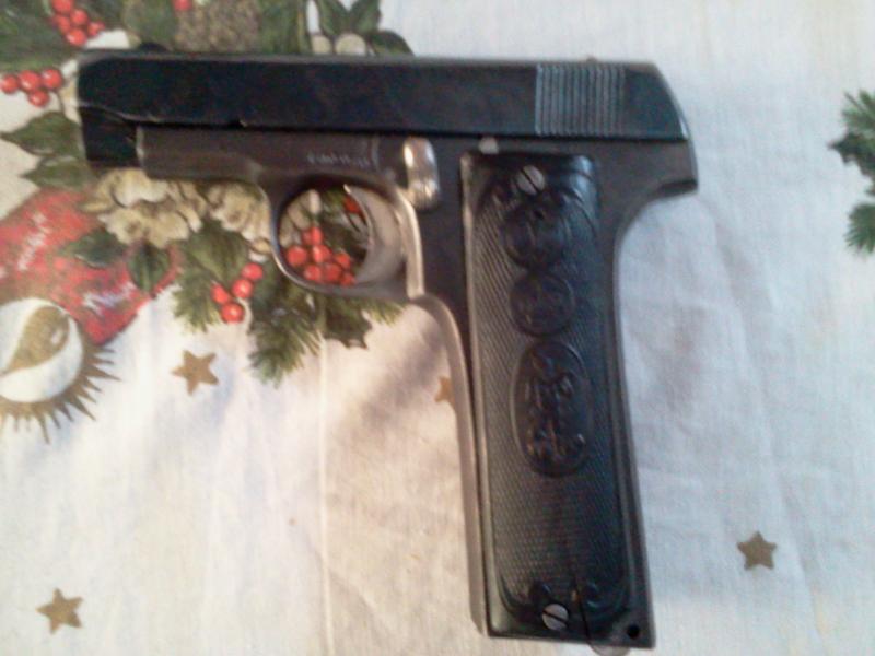 La de tu foto es una "Gabilondo y Cª" modelo "Danton", una de las muuuchas copias eibarresas de la pistola Browning 1.910. La de la "ignota" del compañero tiene unas cachas muy peculiares, a ver si la ubicamos. En esa época en Eibar había una multitud de pequeños talleres armeros.