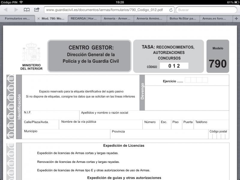 Preparando el Mod. 790 de pago de tasas me surgió una duda y es que se le otorga un número a ese trámite de haber pagado la tasa correspondiente ya sea para expedir, guiar, etc. Si me descargo de la web de la GC el modelo y lo imprimo en casa viene sin ese número. En realidad la cantidad para guiar un arma son 7,33€. Pero si pago en banco esa cantidad le otorgan el número en la IA a posteriori cuando vaya a retirar el arma? o debo ir antes con el Mod. 790 en blanco a la IA para q le den dicho número y después realizar el pago?