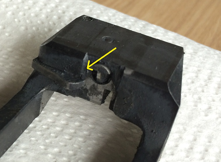 La parte de la corredera que te mostré en la imagen anterior, la suelo sumergir en gasolina para limpiarla a fondo, y después de estar bien límpia le doy una gota de aceite a la aguja percutora por su parte de atrás, y al eje y el muelle de la uña extractora. No le des aceite por la parte delantera; por "la parte de dentro"; porque eso hace que se pegue más la carbonilla en esa zona.