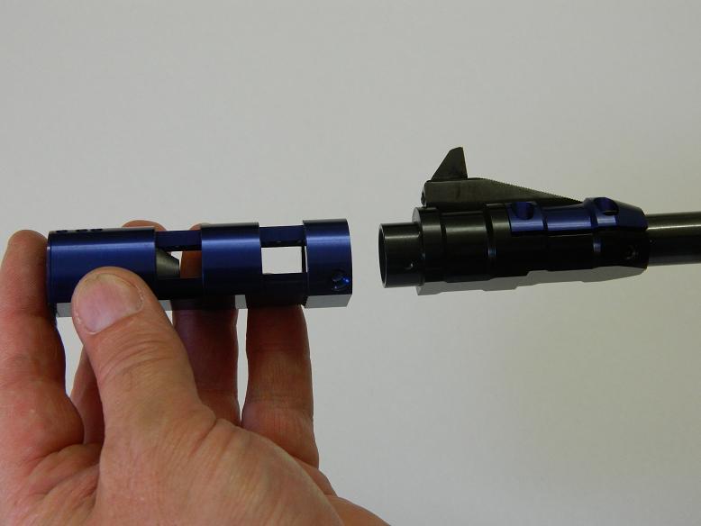 Para instalar el compensador de color rojo que lleva la Toz 35 de la imagen que puse, al igual que ocurre con el de la Hammerli 160 Special, no hace falta quitar la base del punto de mira de la pistola. Este compensador que lleva esa Toz 35 (un "B1 Compensator") se compone de 3 piezas. La primera es una pieza central (la de color negro) que se inserta en la boca del cañón y hace tope con la base del punto de mira. Luego está una segunda media pieza superior por detrás de la base del punto de mira (de color) que hace también tope con el comienzo de la rampa del punto de mira y mediante cuatro tornillos se sujeta desde arriba a la primera. Y por último se coloca una tercera pieza más larga, también de color, con todo el sistema de agujeros, ranuras, etc., la cual se acopla y fija en el extremo anterior, por delante de la pieza negra. Pongo una imagen para que se vea mejor lo que digo, por si algún manitas está interesado en fabricarse un compensador similar para su pistola.