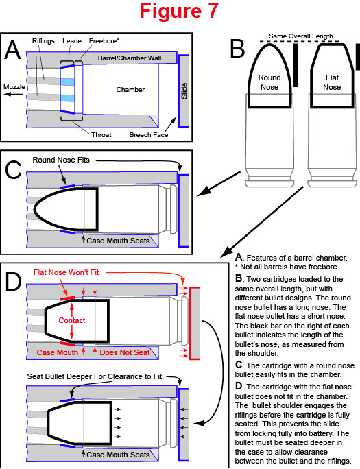 Coincido con urbanciclo, con esa longitud de cartucho usando punta troncocónica es muy normal que en un arma de precisión te toque la ounta en las estrías, ya que el cañón tendrá muy poco vuelo libre (ideal para precisión). Con puntas troncocónicas los cartuchos necesitan ser más cortos que con ojivales, dado que la zona cilíndrica es mayor. Te pongo un esquema de lo que te está ocurriendo.