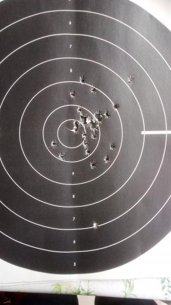 Esta mañana la he probado. Después de centrar el arma, a precisión, he tirado 30 tiros a duelo, 20''. Os muestro el arma y la diana.