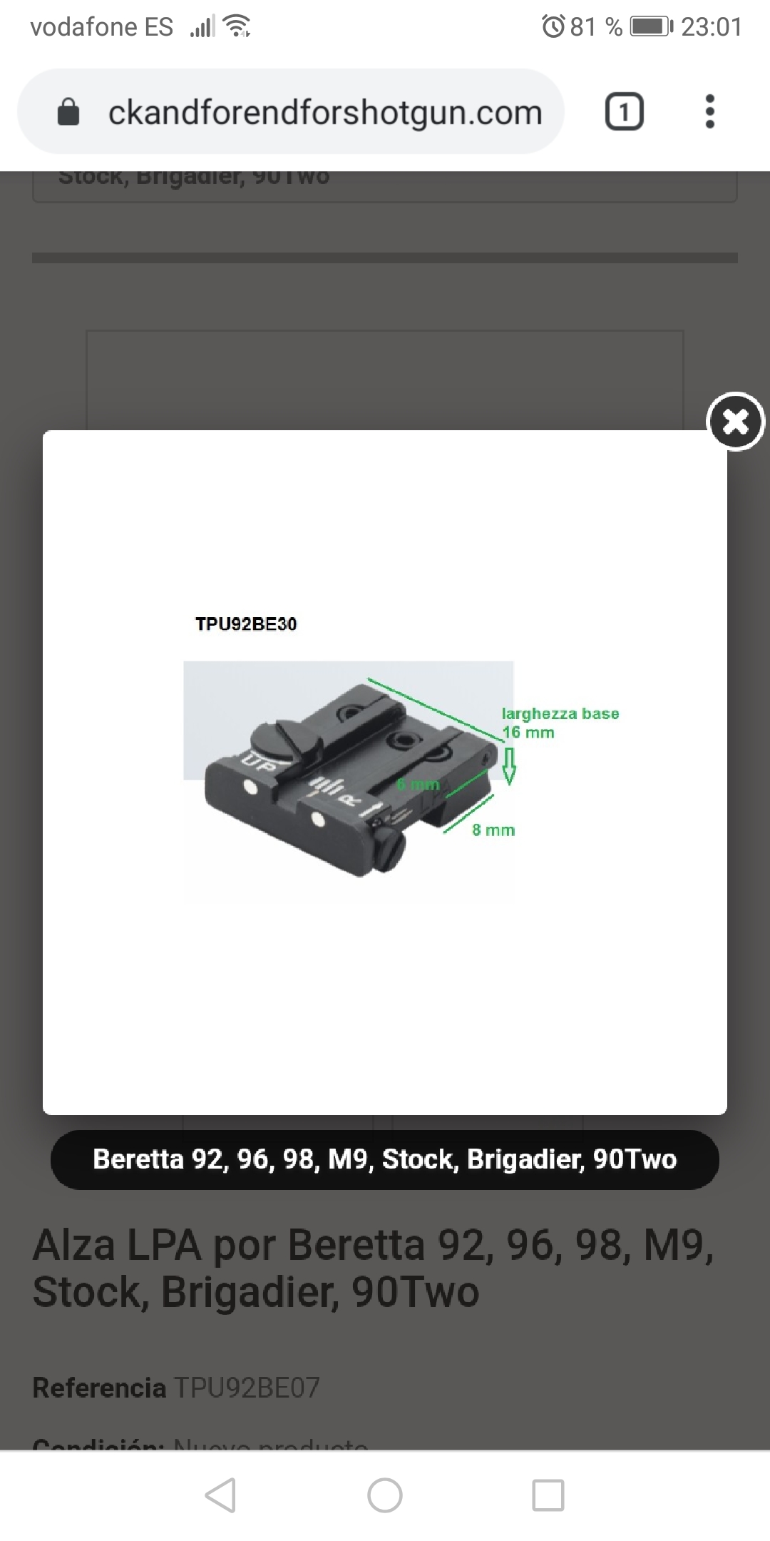 Pero resulta, que si no me he equivocado, las medidas que he encontrado en la página de lpa para la Beretta 92 FS son las de la foto que os adjunto.