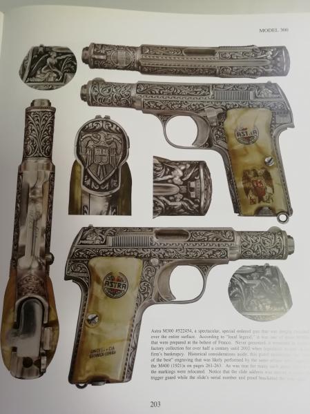 Para endulzarte un poco la falta de noticias, he fotografiado a mi vez un par de páginas donde habla de este modelo en el libro "ASTRA FIREARMS AND SELECTED COMPETITORS", para que te deleites con la calidad del trabajo de nuestros artesanos. Por cierto, de una de ellas, la más labrada, se dice que fué una de las tres que se grabaron con la intención de regalarselas al General Franco, aunque al final se quedaron en la colección de la fábrica
