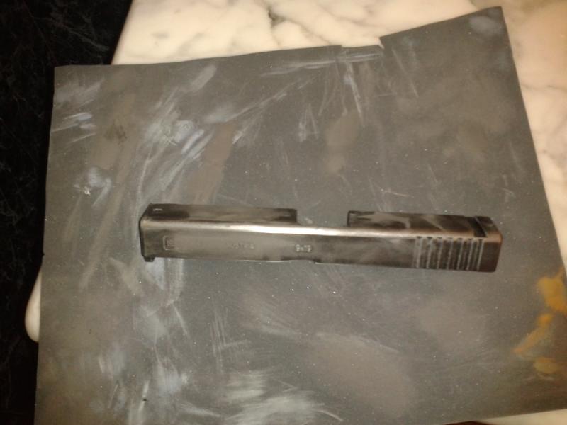 En el siguiente paso, lijamos la corredera con papel 000 o 00, para abrir los poros y quitar el pavonado viejo o en el caso de la Glock el acabado tennifer. En el armazón no es necesario lijar, debido a la porosidad del mismo y porque joderiamos el polímero.