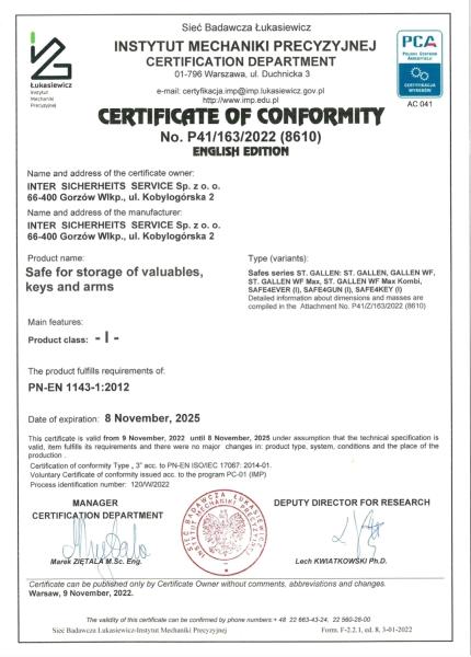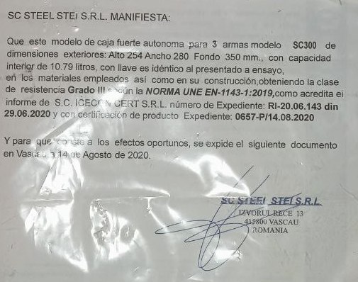 Opino que la norma EN 1143-1 no autoriza a certificar el número de armas que caben en un armero. Esa norma solo se refiere a los métodos de ensayo. El fabricante solo puede certificar la dimensiones exteriores e interiores.