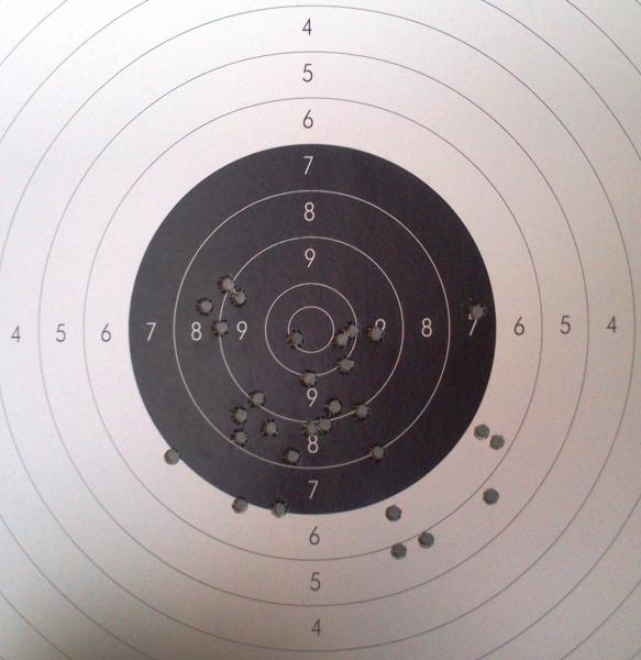 Me he visto incapaz de mantener la pistola quieta. Aparte de la falta total de entrenamiento he adelgazado unos kilos y he perdido masa muscular en los brazos, que creo que me ha afectado. Se me iban muchos impactos bajo.
