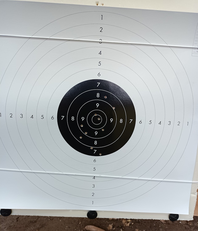 Quiero achacarlo a que con más entrenamiento mejoraré, pero hoy me siento atascado. Hice dos dianas de 20 disparos y en las dos los resultados fueron casi iguales. Excepto una tanda de 5 en la que la agrupación debió ser la mejor que hice hasta ahora (todos muy juntitos), el resto, centrada pero esparcida por el 7 y el 8.