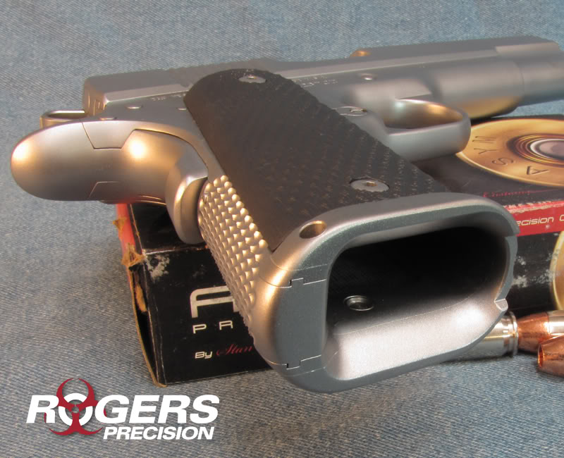 Para aquellos que tengan 1911 sin picado frontal en la empuñadura, comento que yo he comprado a un compañero del foro una de estas piezas de Wilson Combatt, son una simple lámina que se sujeta sólo con las propias cachas. El agarre mejora muchísimo, la estética no desentona y son económicas.