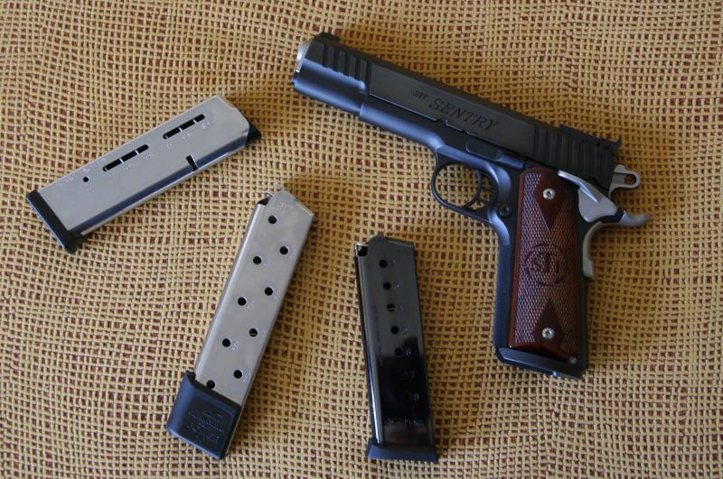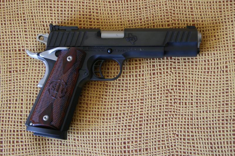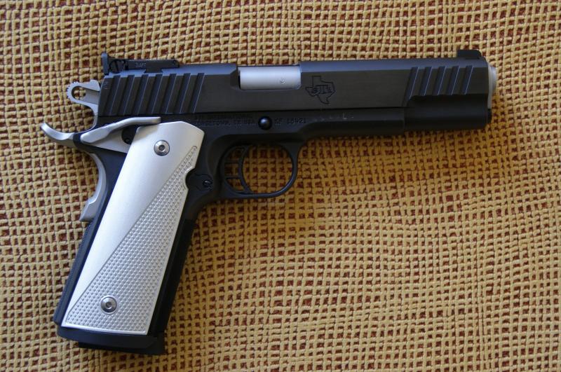Bueno, pues esta es la mía: una STI modelo Sentry del 45 ACP. Creo que no debe haber muchas de estas por aquí. Tenía ganas de una 1911 de línea clásica pero con algún detalle moderno y ésta me pareció interesante. Después de once meses de espera, la tengo ya en mis manos aunque aún si un solo disparo. Este modelo concreto lleva armazón de acero forjado. Más detalles en la página del fabricante: