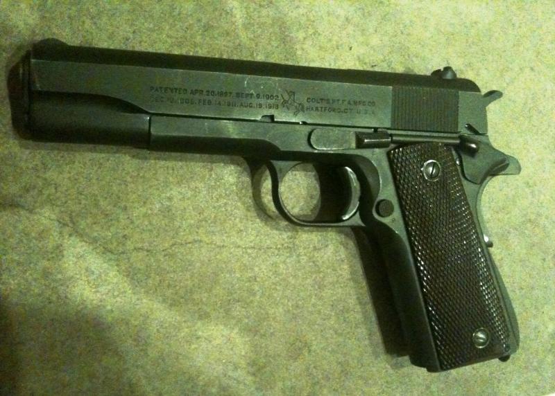 Fijaos atentamente, en la 1911, la que tiene empuñadura delantera de una Thompson, y cargador extra largo. Apuesto que dispara en rafaga.