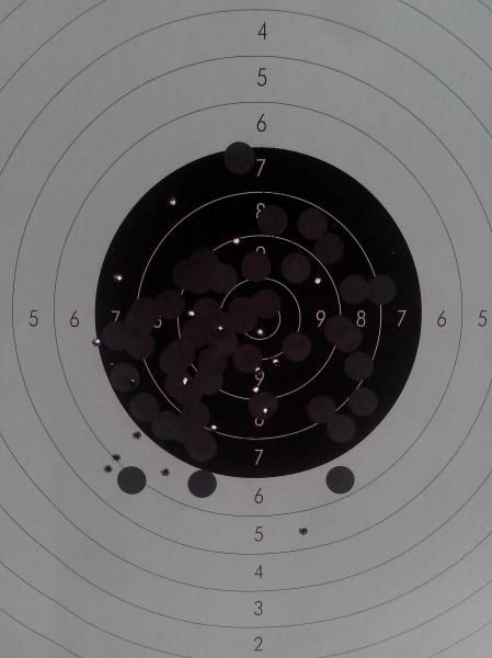 En las de 20 y 10", aparte del gatillazo que comentas, que hace que se salgan disparos abajo y a la izquierda, veo que el arma no la tenías firmemente sujeta y hace que no agrupes.