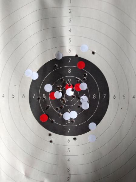Los primeros cinco disparos con parche en rojo, los siguientes en blanco y los restantes sin parchear, ya más relajado cogiéndole el tacto al disparador.