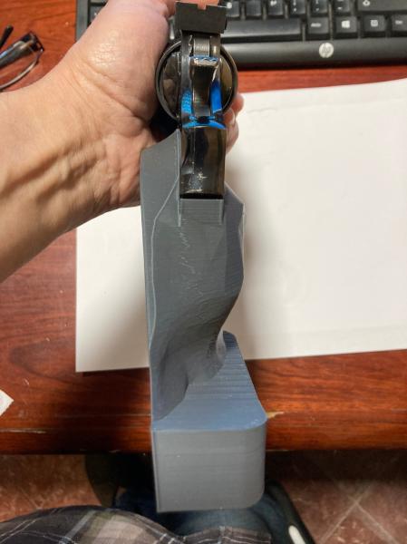 Le di el mismo ángulo que tiene la cacha con la FAS, acerque la empuñadura al máximo al armazón y el tema mejora mucho. Mejor equilibrio, posición del dedo más natural, etc.