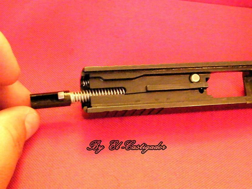 Una vez la hemos introducido un poco está hara tope con el muelle del bastago de la uña extratora para lo cual cojeremos el destonillador y ligeramente presionaremos sobre el muelle de la uña extratora para poder empujar la tapa trasera de la corredera y poder llevarla a su ubicación en la corredera.