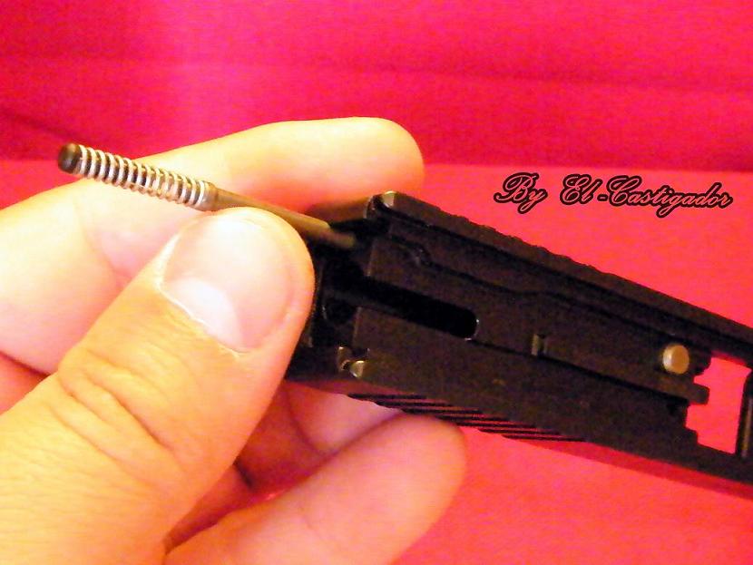 Despues procederemos a poner el muelle recuperador de la corredera de igual forma, introduciendo primero el extremo de plástico en el alojamiento que tiene la corredera en la parte de la boca del cañón, para luego con una pequeña presión en la parte contraria del muelle de la corredera ubicar la pieza de metal que porta el muelle en el alojaminento que tiene el cañón para la misma.