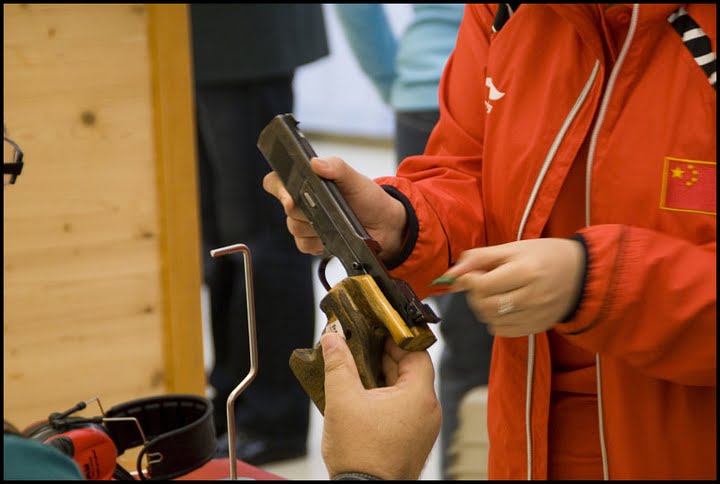 La pistola que utilizo para la prueba de 25 metros fue una Margolin MCM modificada. Mejor dicho: muy modificada, tanto que no parece una Margolin. Una muestra tipica del buen hacer de los armeros rusos en cuanto a modificaciones artesanales se refiere (me parece que estos las modifican sin miramientos, a base de martillazos, soldaduras y remaches). Juzgad vosotros mismos.
