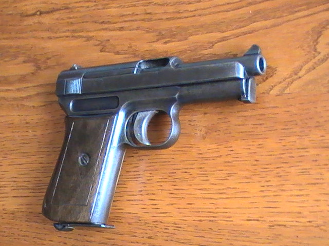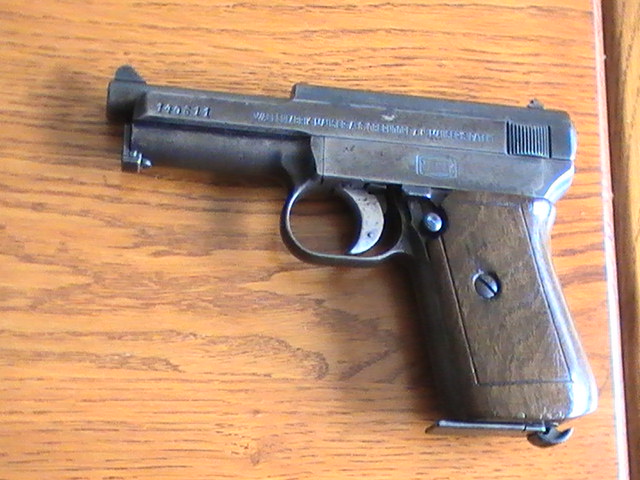 Pistola Mauser modelo 1914, 8 golpes en 7,65 mm browning, cañón fijo y muy preciso hasta 50 metros.