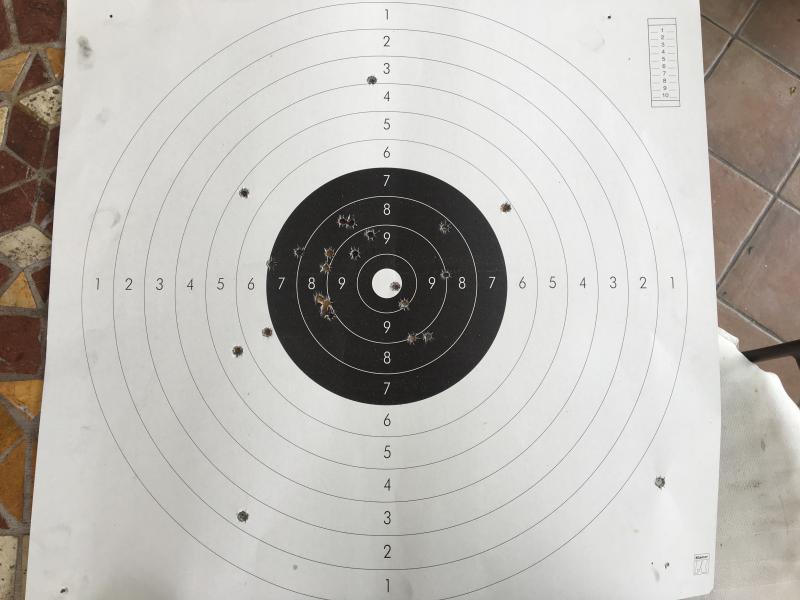 Después de unas semanas unos 400 tiros creo que ya estoy empezando a agrupar con mi nuevo revolver, aún se me escapa algún gatillazo que otro como se ve en la diana, intentó mejorar el tiro en seco y los tiempos del duelo para cuando toque estrenarse en una competición. Vosotros cuando entrenáis el duelo desde 45 grados al levantar sobrepasáis para luego bajar expulsando el aire y alinear? A mí 3 segundos para todo se me hace muy justo... con respecto a ajustar las miras he pensado darle un par de toques a la derecha, que os parece!? Un saludo