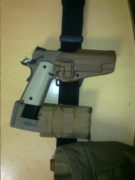 Os presento a mi hace poco adquirida y recién puesta a punto, Kimber 1911, con cargador de 11 cartuchos y linterna ML-3. Ahora solo necesito una buena funda para linterna, que me está costando encontrar algo de las características de la Blackhawk.