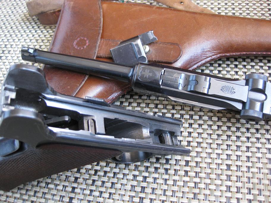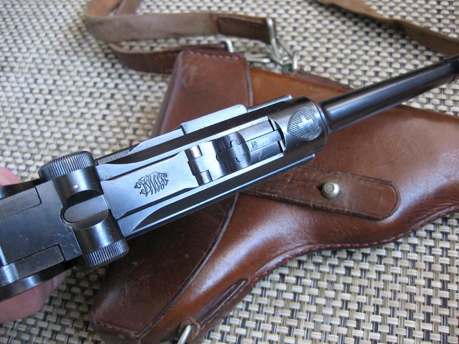 Una DWM para el Ejército Suizo. Con funda suiza original de G. Lehmann, de Sattler, en Berna, una de las mejores fábricas de fundas, tahalíes y objetos de cuero para el Ejército Suizo.