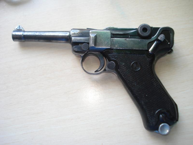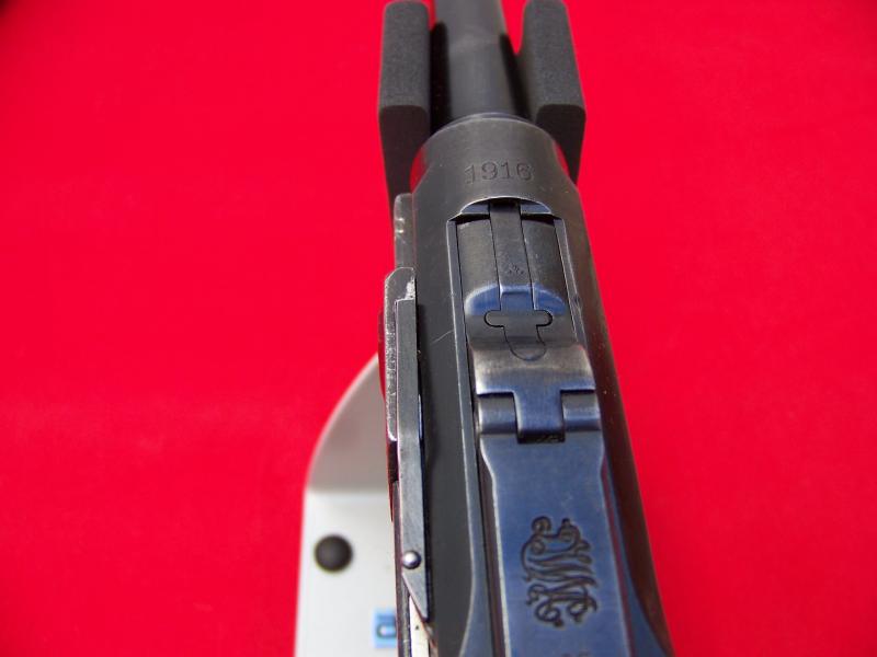 Una DWM de 1916 con todos los números coincidentes excepto el cañón, por la simple razón de que fué sustituido por la armeria de la Policia en Berlin alrededor del año '35, como atestiguan los marcajes "TP" y aguila de Weimar que tiene el el lado derecho del mismo, asi como el seguro Schiwy que solo le fué incorporado a las policiales.
