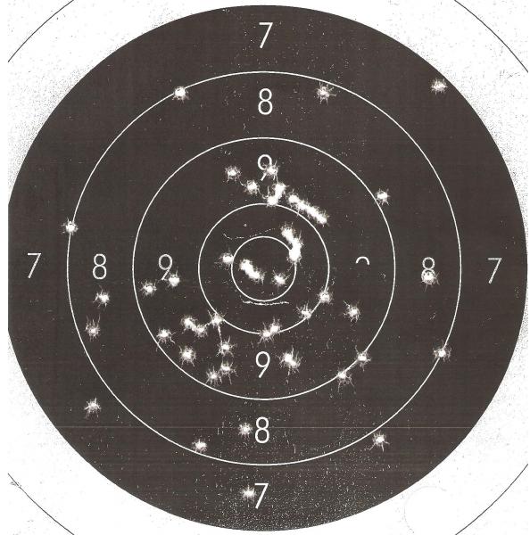 En esta última diana se ve que le vas cogiendo el punto al disparador y las desviaciones hacia arriba y abajo se deben posiblemente a la falta de costumbre con el alza en U o a no mantener la apnea a medio pulmón.