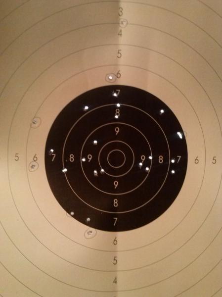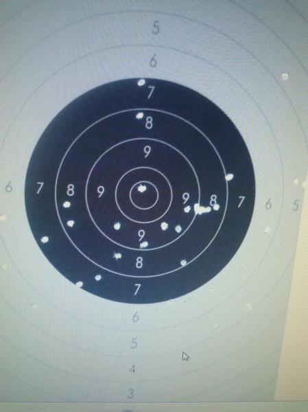 Patria: Poquito a poco...no está mal ese blanco, pero hay que hacer la agrupación mas pequeña. Puede que cometas un pequeño error con la posición del dedo pulgar y que no apoyes bien el indice en el disparador (disparos abajo a la izquierda). Siempre contando con que seas diestro claro...