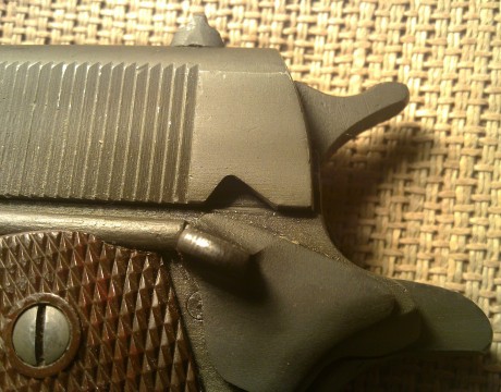 Y a este propósiti Javichin dice "asín": "Tengo el placer de confirmarte que tienes una autentica Remington Rand del año 1943 que fue suministrada al imperio britanico como prestamo y arriendo. En algun momento entre el año 1943 y 1945 paso por un deposito militar americano (dentro del Reino Unido) y le instalaron una autentica corredera de reemplazo (estas correderas de repuesto se fabricaron hasta Octubre del año 1943 y llevaban marcado en su costado derecho M1911 A1 US ARMY). Por desgracia los tres cargadores originales General Shaver con que venia la pistola han desaparecido, el que trae no es el correcto de la 2GM. Falta por analizar el cañon y el interior de las cachas para ver si son originales.