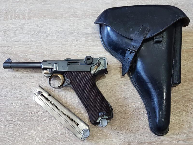 Luger p.08 Alemana del tercer Reich ,código 42 de 1940 en la parte derecha de la corredera dos marcajes de aceptación Wuffenamt SE655 de Mauser ( Stick Eagle - Águila de alas rectas )