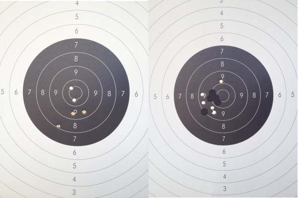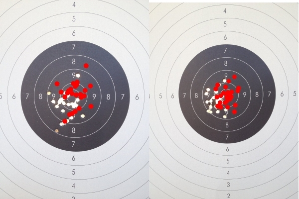 En ambos casos se comprueba claramente que las miras de las dos pistolas no estaban ajustadas para la vista de Pablo. Por eso me he tomado la "licencia" de hacer una corrección virtual del conjunto de los 25 impactos. En los dos blancos varios clicks arriba y hacia la derecha.