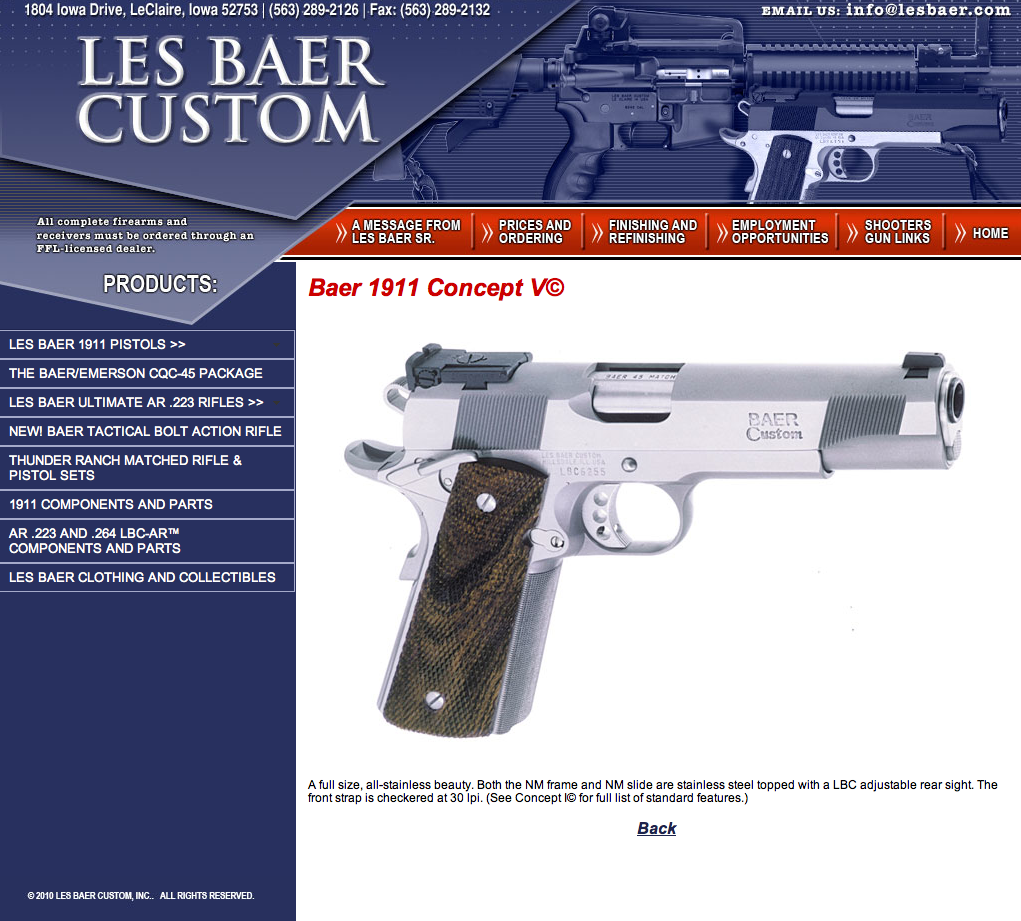 En cuanto a lo que Les Baer hace 10 años que no fabrica en inox, pues no sabría decirte. La mía es totalmente nueva y te adjunto captura de su web con el modelo Concept V en inox. Es verdad que las pistolas fabricadas en acero al carbono permiten ajustes más estrechos por ser este material más duro que el acero inoxidable. Por ese motivo, las Les Baer en acero al carbono precisan de un periodo de rodaje algo mayor que sus equivalentes en inox. De hecho, Les Baer sólo ofrece la garantía de pulgada y media de agrupamiento a 25 yardas en los modelos en acero al carbono. No obstante, estamos hablando de unos márgenes estrechísmos y casi irrelevantes para el 99% de los tiradores. Una Les Baer en inox es más precisa que cualquiera de nosotros...