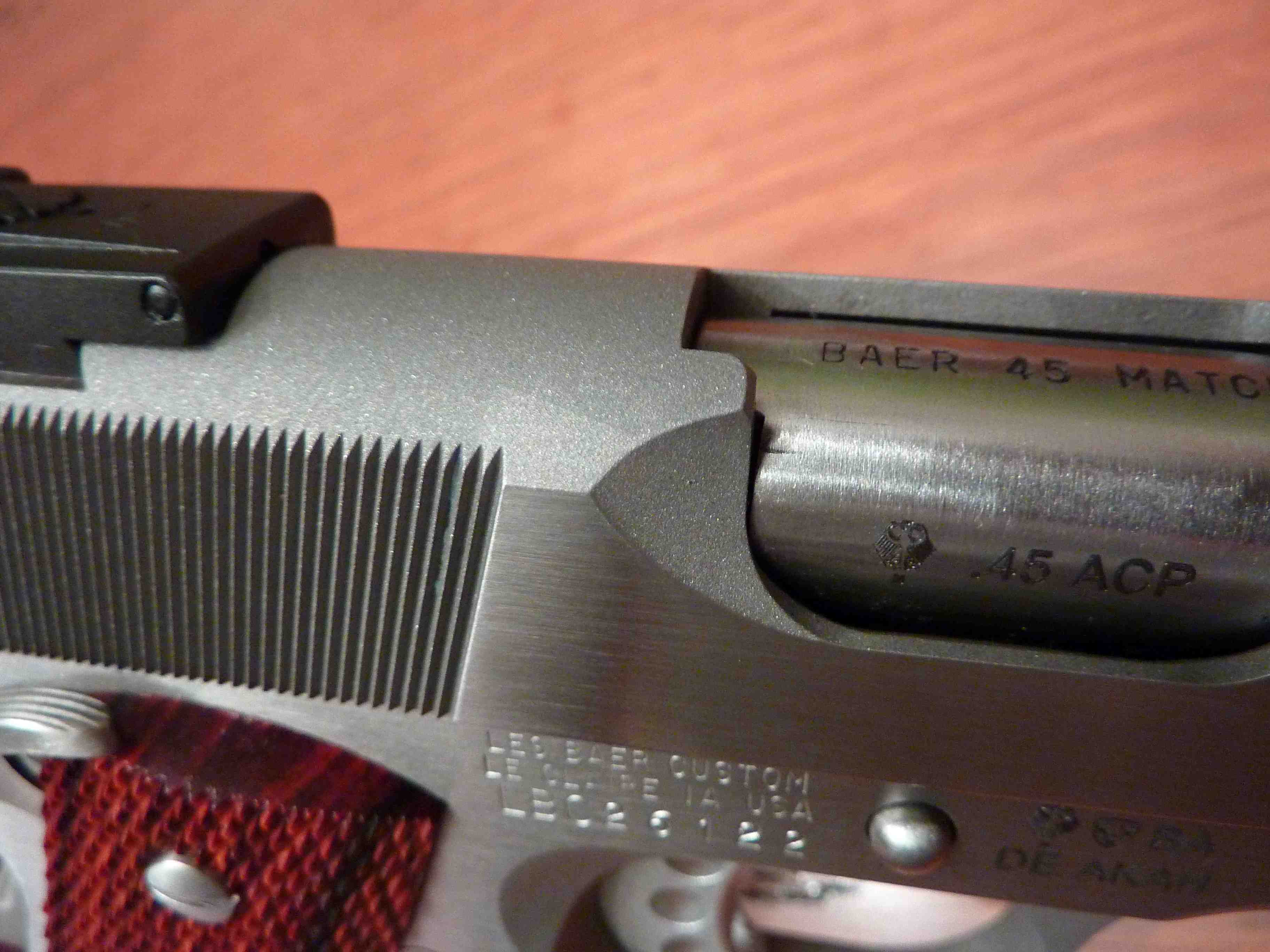 Les Baer abandonó ya hace 10 años la fabricación de pistolas en acero inoxidable, con el fin de poder mejorar las tolerancias al mínimo, de sus estrechos y precisos ajustes corredera-armazón, por lo cual sospecho que la que muestras, aunque parezca stainless, posiblemente se tratará de una pistola construída en acero al carbono al acabado cromo duro.
