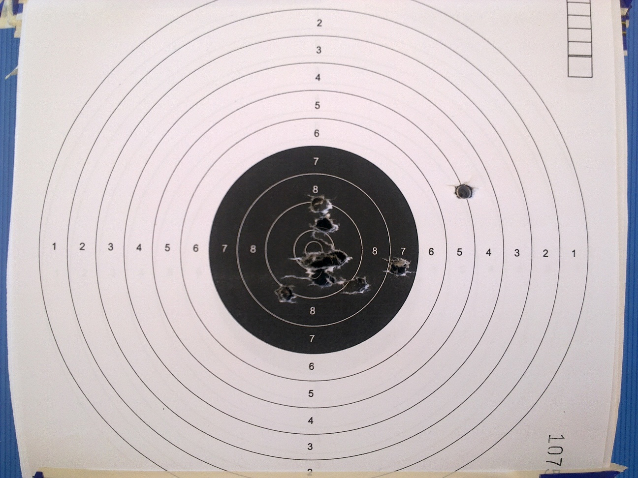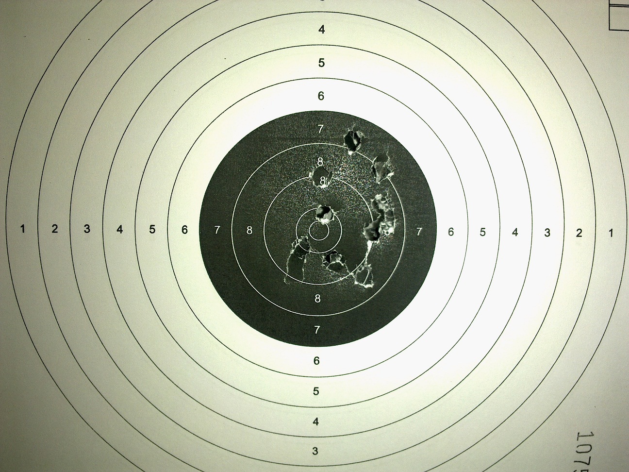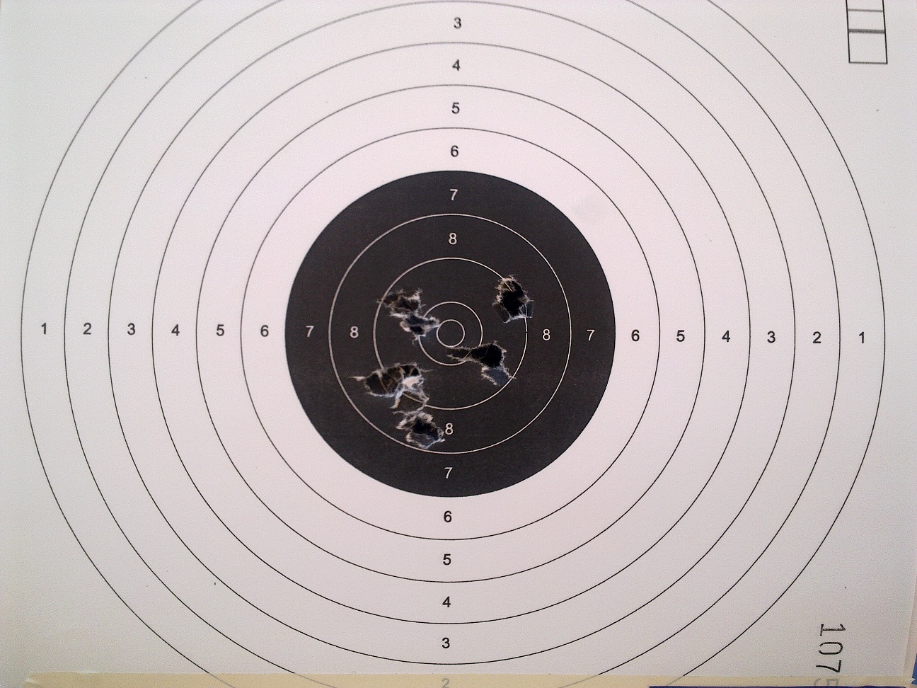 El quinto: Muy buena agrupación algo a la derecha bajo, y el error (menor, pero el tiro esta ahí) a las 2 , las mismas consideraciones, alineación del tirador, revisar el dedo.