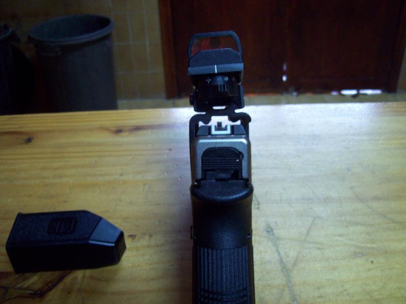 Aqui os dejo mi glock 19, tiene base israelita (no me acuerdo el nombre y un visor de los normales. Con ella pense competir en Modificada pero cuando fui a mi antigua federacion (no me dejaron) y tuve que competir en Open, ese año quede Campeon, no por bueno sino porque habia pocos tiradores de Open, solo tuve un miss. Si os fijais la base de la montura esta comida (lima a fondo) para que entre eun funda de competicion. Ventaja cuando se funde la pila del visor puedo apuntar con las miras originales y nadie nota nada. Ahora ya esta apalabrada la venta pero me lo he pasado de muerte con ella. La echare de menos. Esto demuestra que con poco dinero se puede competir en Open, eso si sin aspiraciones a nivel nacional pero para divertirse un monton. La acompaña dos cargadores de 15, dos de 17 y uno de 33. Si el que me la apalabro se echa pa tras. La pondre a la venta aqui el año que viene. ¿que os parece? Un saludo :pist: