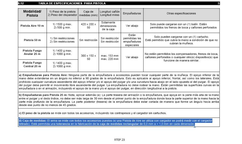 Hola: ver artículo 8.12 del Reglamento Técnico Especial de Pistola, en el que aparece una tabla con las dimensiones de las armas de las diferentes modalidades y un comentario sobre las empuñaduras. Y en el 8.13 aparecen algunos dibujos sobre dimensiones de las empuñaduras. Saludos.