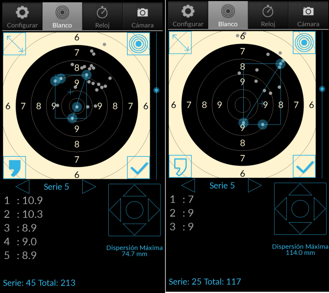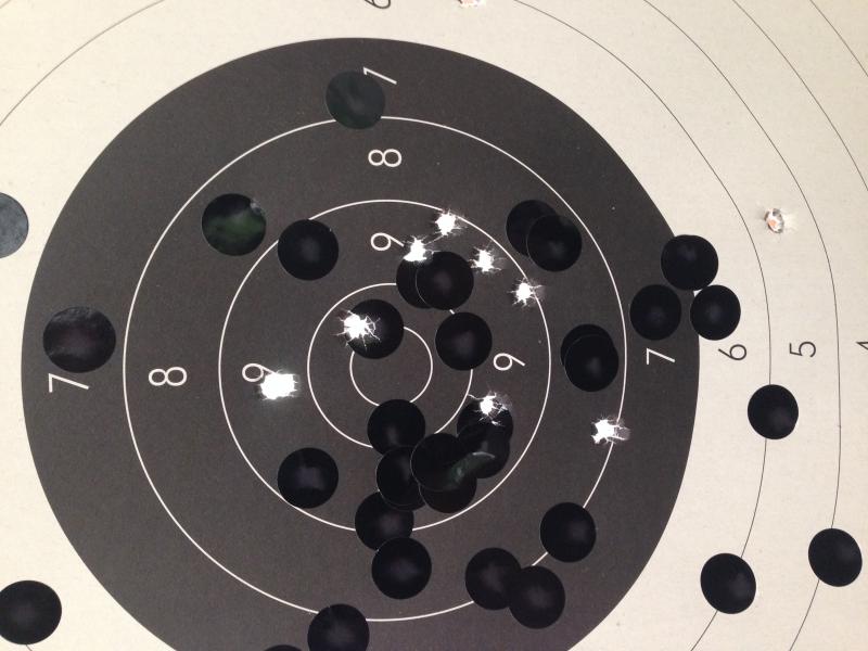 Si la pistola está en condiciones normales de fábrica, no te deberías salir del 10 en el blanco de 50x50 a 25 metros.