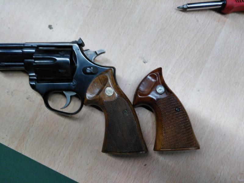 Probé hoy las cachas de combate del Astra 357. Podría decir que son las mismas que las de mi 44 de armazón de empuñadura cuadrada. La parte derecha no llegó a sentarse, pero es cuestión de dos pasadas con una lima.