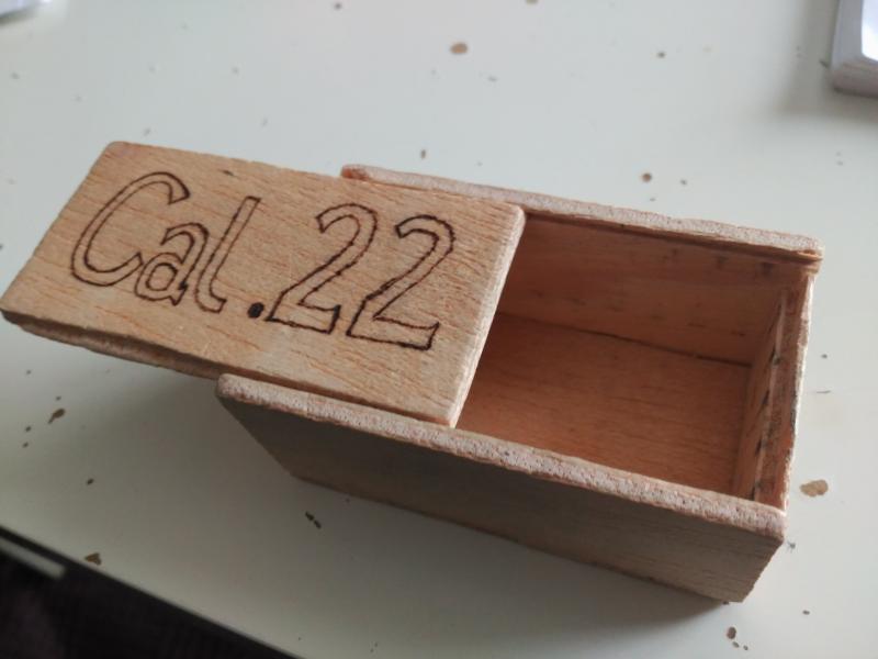 Es una caja para la munición del 22. Tengo una en la que me caben 100, pero no la tengo a mano. La diferencia entre ellas es que a la mitad, tiene un trozo de madera fina donde apoyan los extremos de los blister de plastico para no hundirse por el centro.