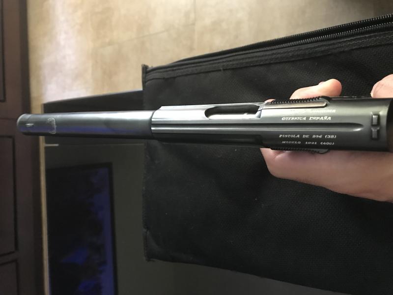 El marcaje en el armazón con la "estrellita de mercedes", como dice Bonifacio nos dice su origen militar. Pero sobre la corredera pone "9 m/m (38)" que es lo que ponía en las versiones civiles para exportación (por su compatiblidad con el 38 auto cartucho de dimensiones parecidas).