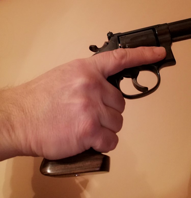 Observo que tu cacha (la que está instalada en el arma) coloca el dedo corazón (el último que va arriba en el grip) y el índice escalonados y no en línea, que es la posición antinatural de la que adolecían antes la mayoría de revólveres. Tenías que forzar hacia abajo el índice para llegar a la cola del disparador. La otra cacha es la semi-Jordan, tradicional en los revólveres de combate, y también soluciona en parte ese problema. Vamos, que esa condición es positiva.
