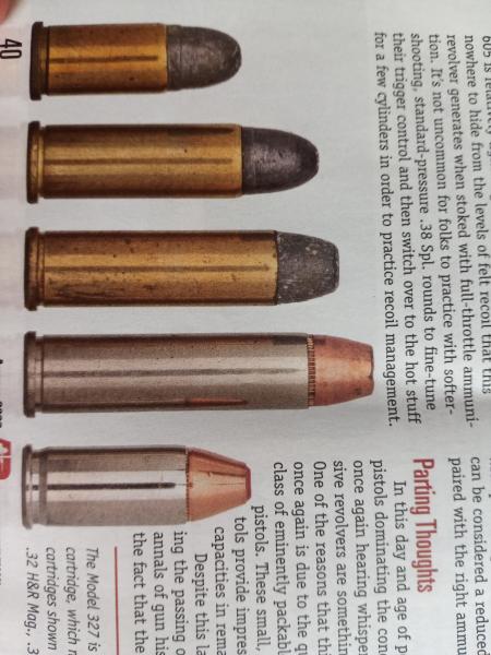 Estaba escribiendo ésto del doble uso en un revólver magnum, sea con su munición sea con la standard de precisión (que es lo que casi siempre hacemos) y tenía en el buzón el ejemplar de agosto de American Rifleman de la NRA. En él viene una foto de los cinco cartuchos que se pueden tirar en un revólver del .32 Magnum, en el caso del artículo un Taurus Model 327. Puede tirar .32 S&W, .32 S&W Long (que, por cierto, es el cartucho que tiramos en Fuego Central y que generalizamos como "el 32"), .32 H&R Mag (el .32 magnum de toda la vida y el del S&W 16-4 que comentábamos ayer), el .327 Fed. Mag. (que es un cartuchete de defensa personal mucho más efectivo de lo que la gente cree ... y que una cuñada mía en Fort Lauderdale lleva en el bolso por recomendación mía) y el .32 ACP.