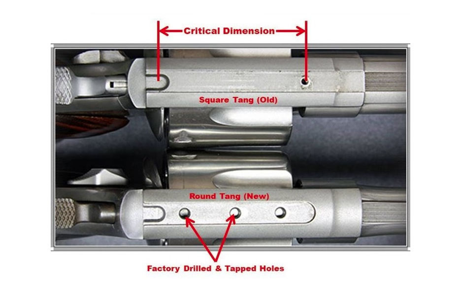En la foto que he subido se ve claro el problema. En la parte superior aparece el armazón antiguo (el mio) que trae un solo orificio para atornillar la mira. En la parte inferior, se ve el armazón moderno, que trae tres orificios para la mira.