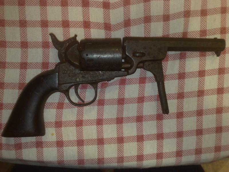 Se trata de revolver muy antiguo, con carga por la parte frontal del tambor,y sistema de palanca para presionar
