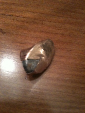 Pues el caso es que mi 952-2 en 6 pulgadas recientemente adquirida a otro compañero del foro tiene la mala costumbre de soltar disparos de dos en dos de vez en cuando...la primera vez que me ocurrió me quedé pálido. Esta tarde me ha vuelto a pasar y encima de la mesa del puesto de tiro me encuentro esto nada más realizar el arma un doble disparo. Es obviamente un proyectil del 9PB deformado. Acababa de ser disparado porque estaba caliente y yo era la única persona en la cancha disparando 9PB. :shock: :shock: :shock: :shock: :shock: