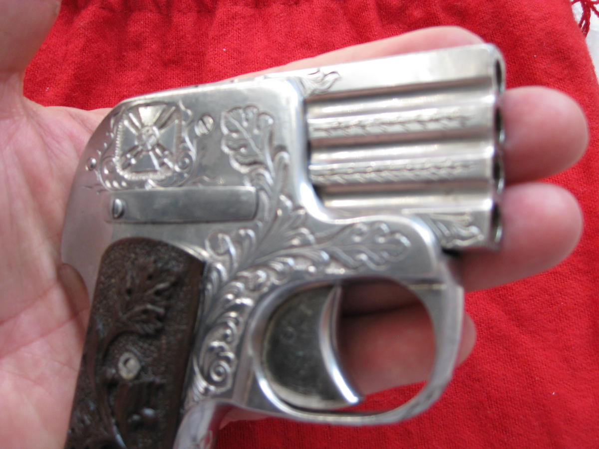Espero que con estos datos le resulte más fácil la búsqueda de su arma, aunque te advierto que será difícil, puesto que los fabricantes querían guardar su anonimato por los motivos antes expuestos, en cambio si la puede encontrar en catálogos de la época (los vendedores no tenían tantos escrúpulos.
