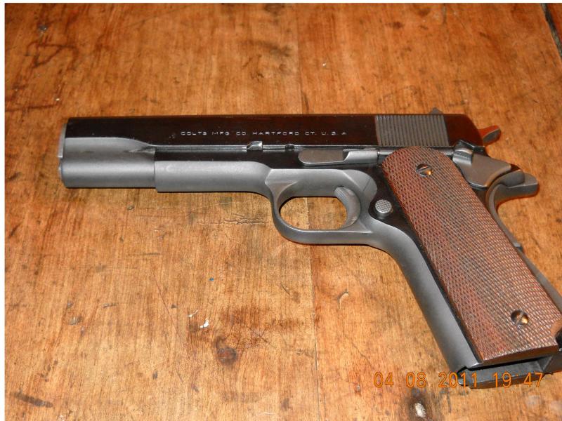 Amigos mios a mis manos llego una 1911 de manos de un amigo que la restauro por el que se que esta repavonada y el la recibio como estaba pero sin el pavon y un poco oxidada, lo que me intriga es que no tiene mas marcas que las de el frente una linea, el numero de serie, bajo la tapa de reten de aguja dos letras C,en la parte delantera del guardamonte un 5 y lo que un pequeño triangulo borroso,en el desconector un 8 yen un fresado interior de la corredera un 4. Es de calibre 38 super el cañon no yiene marcas solo en la parte baja un 8 y es 6 estrias hacia la izquerda. Segun colt colector seria fabricada en 1948 lo que no se es si:- Es realmente una colt.- Si es asi las marcas son originales.- por que no tiene el caballito rampante o algun otro tipo que llevan las colt que yo he visto. desde ya muchas gracias.